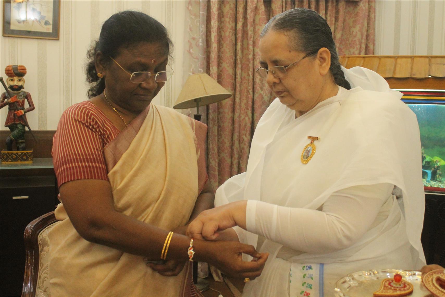 Brahma Kumari Nirmala tied rakhi to H.E. Draupadi Murmu, Governor of Jharkhand, and Shri Raghuvar Das ji, Chief Minister of Jharkhand, in Ranchi and gave them the Godly message, blessings and sweets.